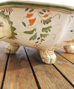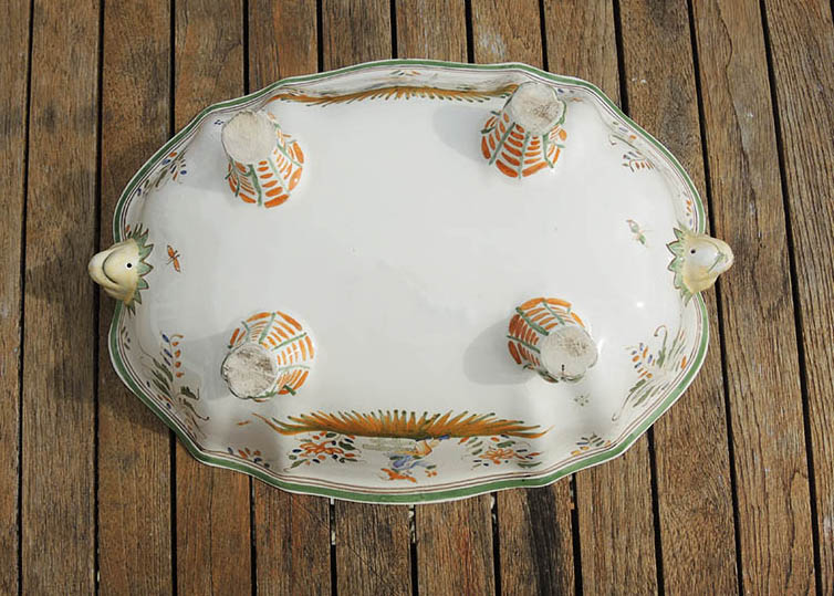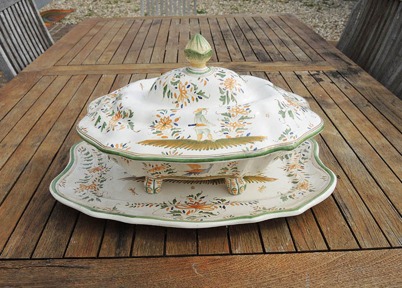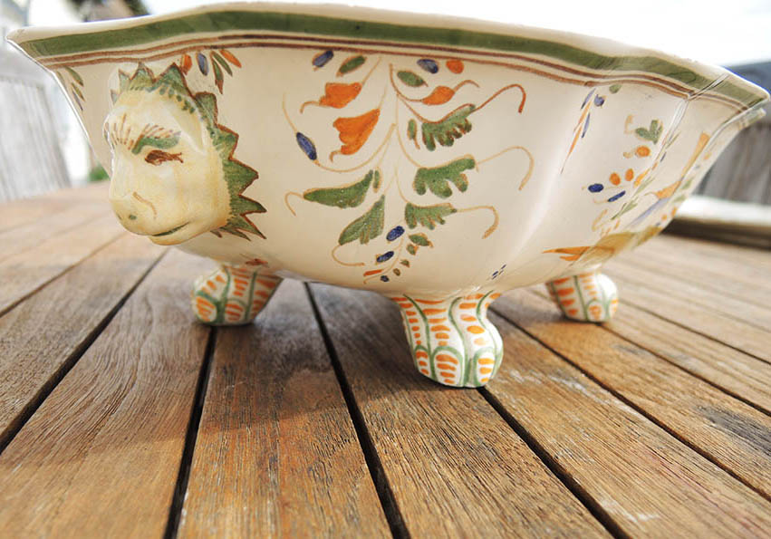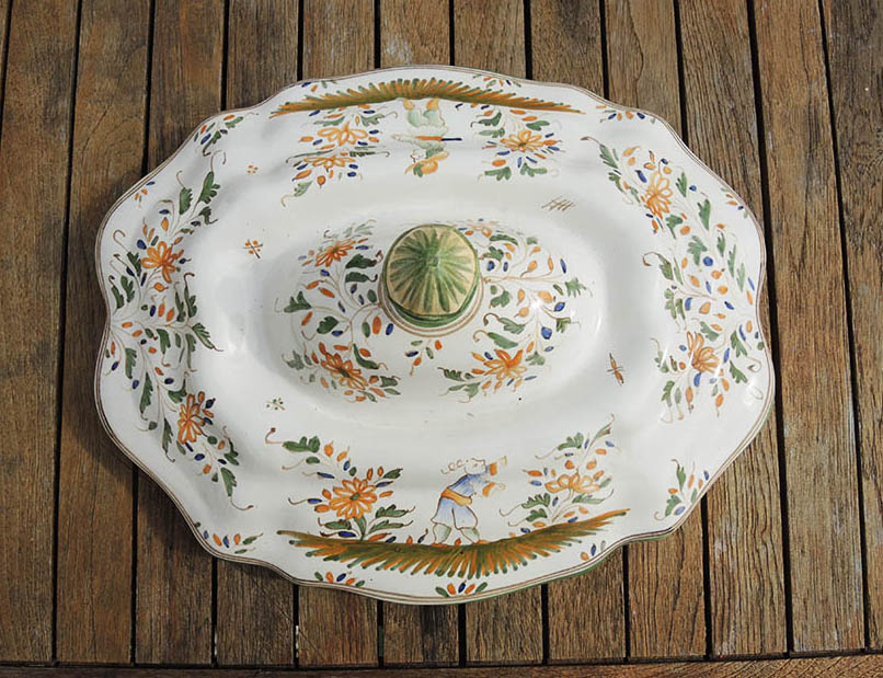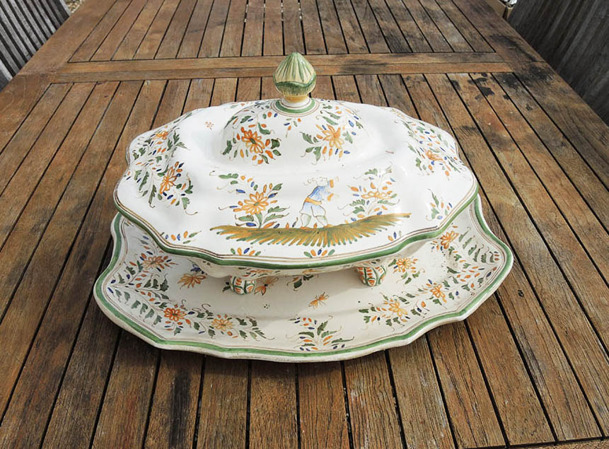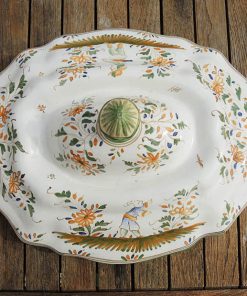 Superbe légumier / soupière en céramique en forme de lion, et son plat assorti, au décor typique de Moustiers :
