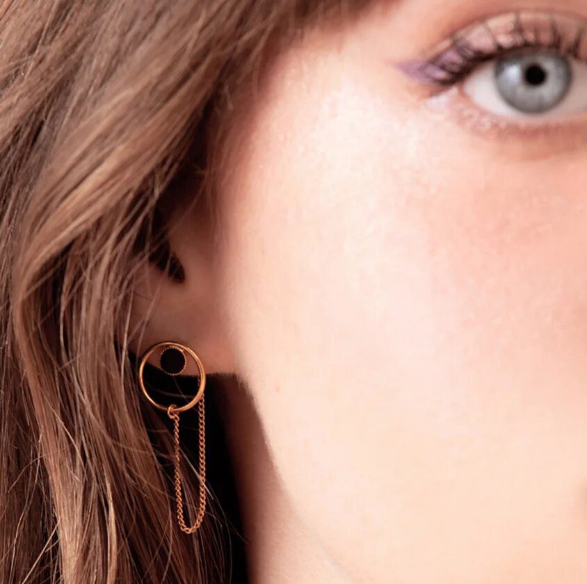 On aime l’univers de Fosseth et son style graphique tout en délicatesse, ultra douces et féminines ! Les puces d’oreilles « Nil » avec chaînettes sont composées d’un cercle doré avec petits confettis de cuir d’agneau incrusté délicatement. On adore le côté original de sa petite chaînette qui se fixe derrière le fermoir pour pendre délicatement de chaque côté de votre oreille. Vous pouvez également choisir de laisser la chaînette pendre complètement: les deux façons de porter ces boucles d’oreilles sont possible! Un belle idée cadeau pour votre adorable maman, une copine qu’on adore ou tout simplement pour soi…