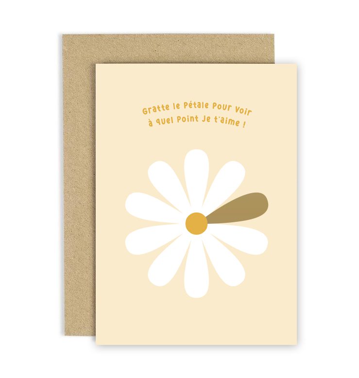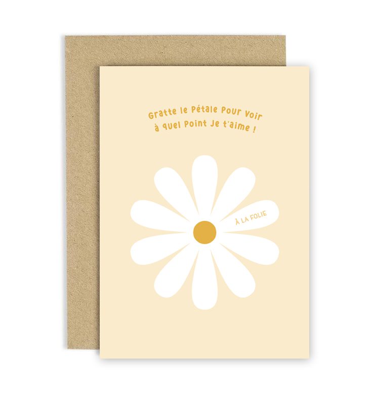 Offrez à votre proche une carte de voeux originale et ludique. La personne pourra gratter le pétale de la marguerite à l’aide d’une pièce de monnaie pour découvrir que vous l’aimez… À la folie ! Parfait pour déclarer votre amour à votre moitié pour son anniversaire, la St-Valentin… Ou n’importe quel jour de l’année.