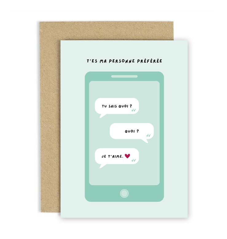 Carte de voeux simple d’une conversation sur What’s App avec cette personne qu’on aime d’amour ! Cette carte de voeux sera parfaite à offrir à votre chéri ou chérie. Rien de mieux pour compléter un cadeau qu’un petit mot ! Vous souhaitez une jolie enveloppe pour accompagner cette carte ? C’est par ici !