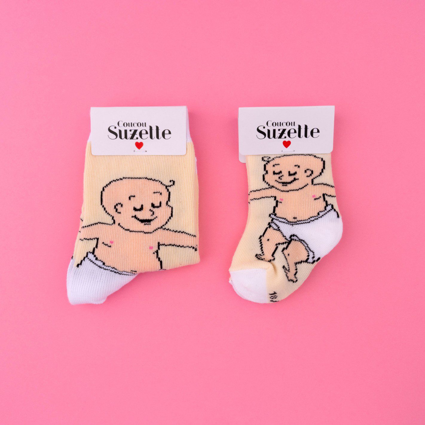 D’adorables chaussettes pour bébé avec comme dessin: un bébé ! Avec sa couche culotte qui épousera la forme du talon, ces chaussettes seront vraiment trop mignonnes aux pieds de votre bout de chou. Idéales également comme cadeau si vous voulez annoncer quelque chose de très spécial à votre famille ou féliciter votre copine à sa Baby Shower. Chaussettes en coton douillet certifié Oeko-Tex et fabriquées en France. Taille: 9-12 mois.