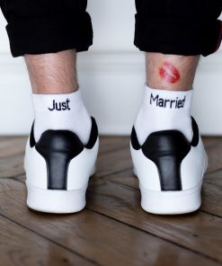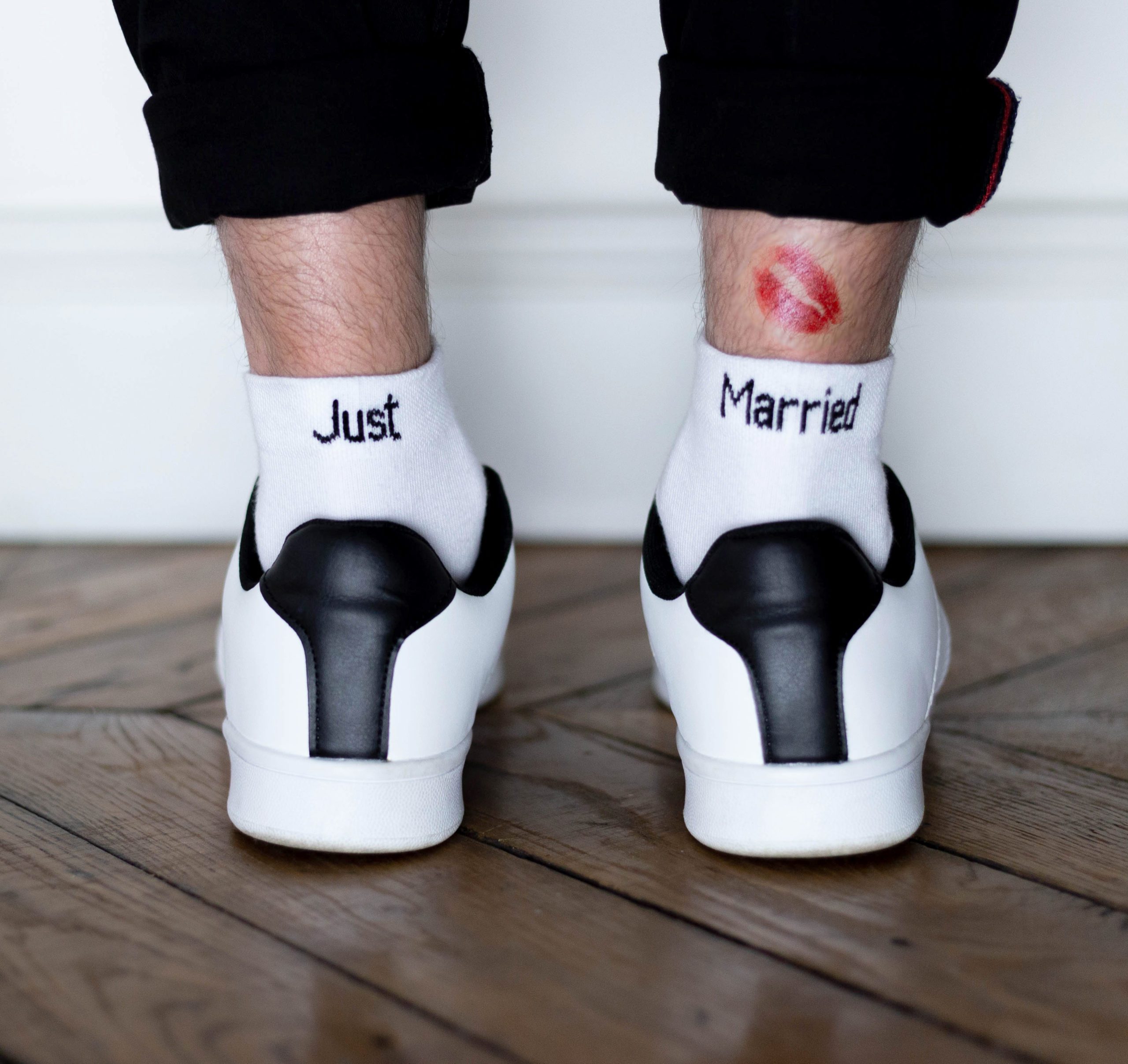 Pour des chaussettes qui vous arrivent enfin à la cheville, craquez pour l’univers KlaK ! Alice, la créatrice, prend un malin plaisir a imaginer des paires de chaussettes dépareillées avec des messages aussi fun qu’originaux. Parfaites pour tous les baskets addicts, ces chaussettes « Just Married » (taille 36-40 et 41-46) est une chouette idée de cadeau de mariage ! À porter le jour J après la cérémonie pour danser toute la nuit en baskets et ensuite au quotidien pour montrer au monde entier votre statut de jeune mariés. Fabriquée en France dans le Limousin.