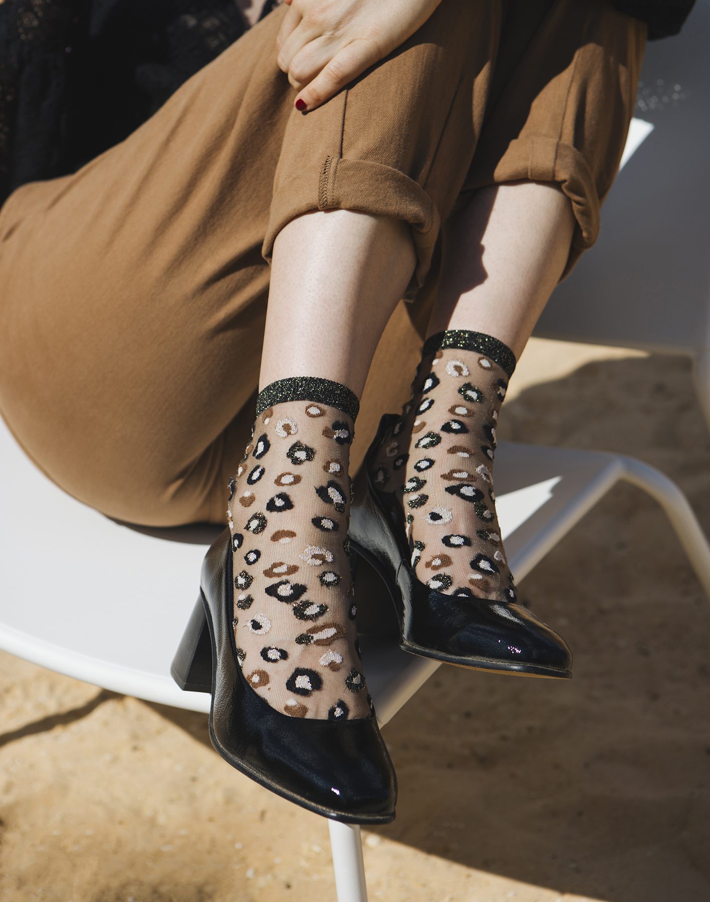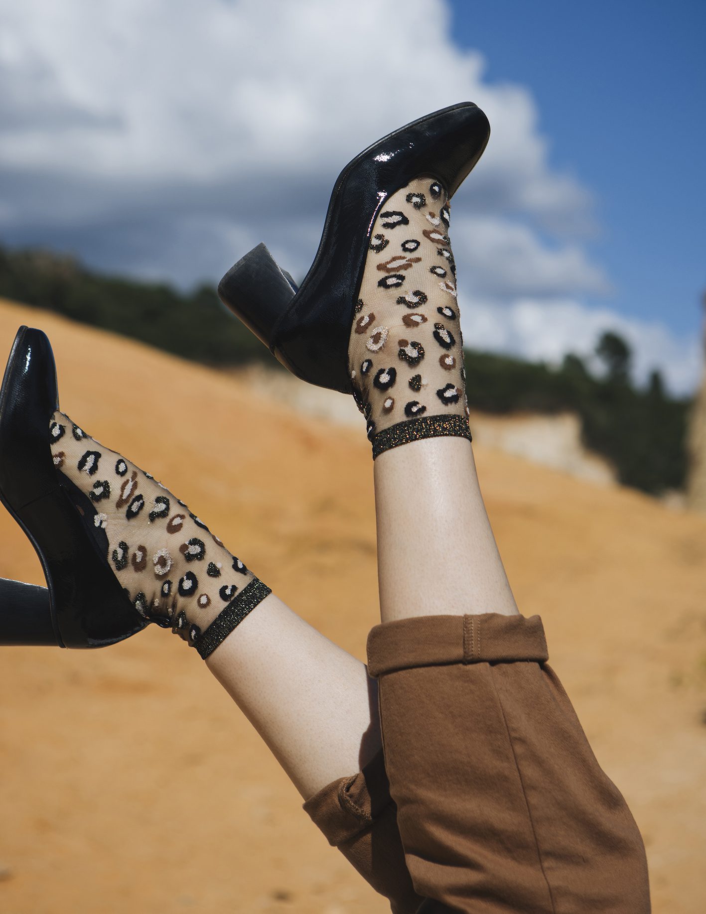 Osez les chaussettes originales et transparentes de la marque Atelier St Eustache ! Idéal avec des baskets, des mocassins, des derbies ou encore des talons hauts pour un look décalé. Tout en transparence avec un soupçon de paillettes, ces chaussettes au style léopard donnent un effet tendance à vos tenues. Côté look, ses teintes dorées, marrons et noires se marient parfaitement avec un pantalon foncé et de jolis escarpins. Le tout, pour un effet wow garanti !
