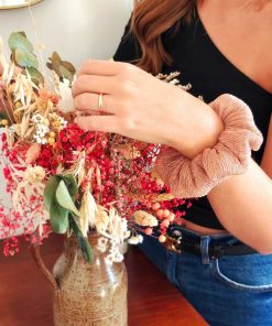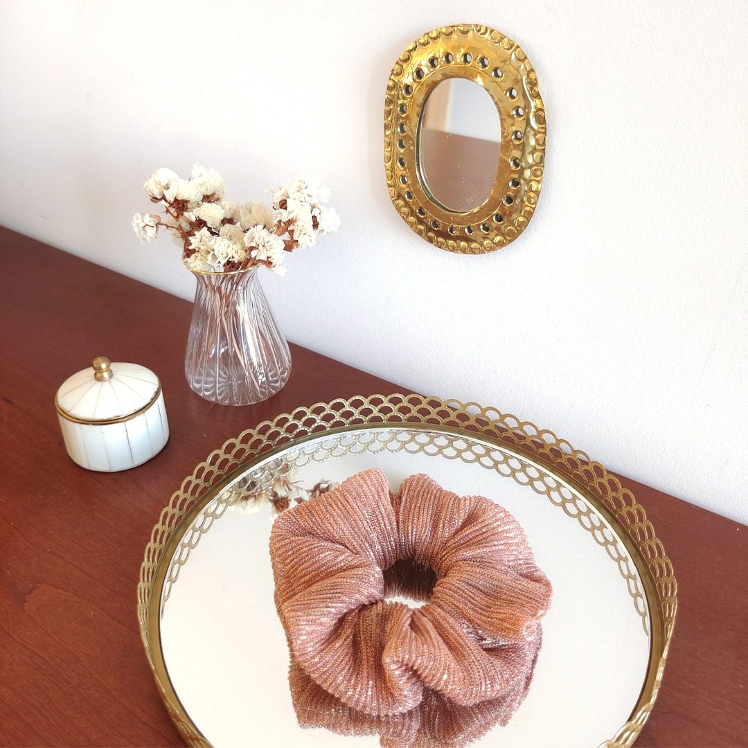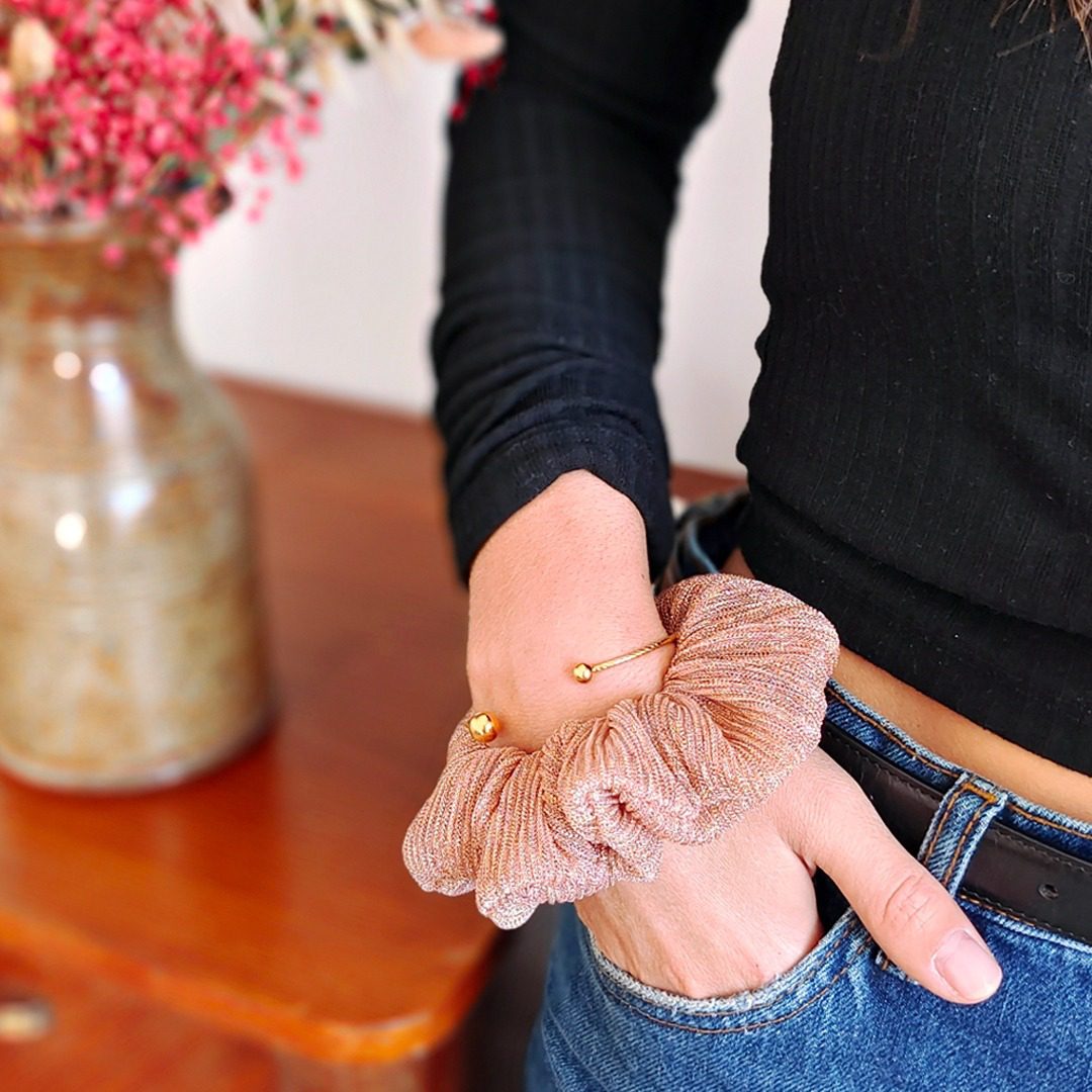 On craque pour les magnifiques chouchous de Laure Derrey. Un accessoire pour cheveux éthique et fabriqué à Paris à partir de chutes de tissus des collections de vêtements de la créatrice ou de déstockage d’étoffes de créateurs. Le chouchou est une pièce caméléon qui permet de nombreuses coiffures et s’adapte à toutes les personnalités. Un accessoire tendance qui peut aussi se garder au poignet, parfait pour pimenter vos looks d’une touche d’originalité en un clin d’oeil ! Entretien: lavage cycle délicat 30°, essorage doux. Couleur or ambre (un rose cuivré à paillette).