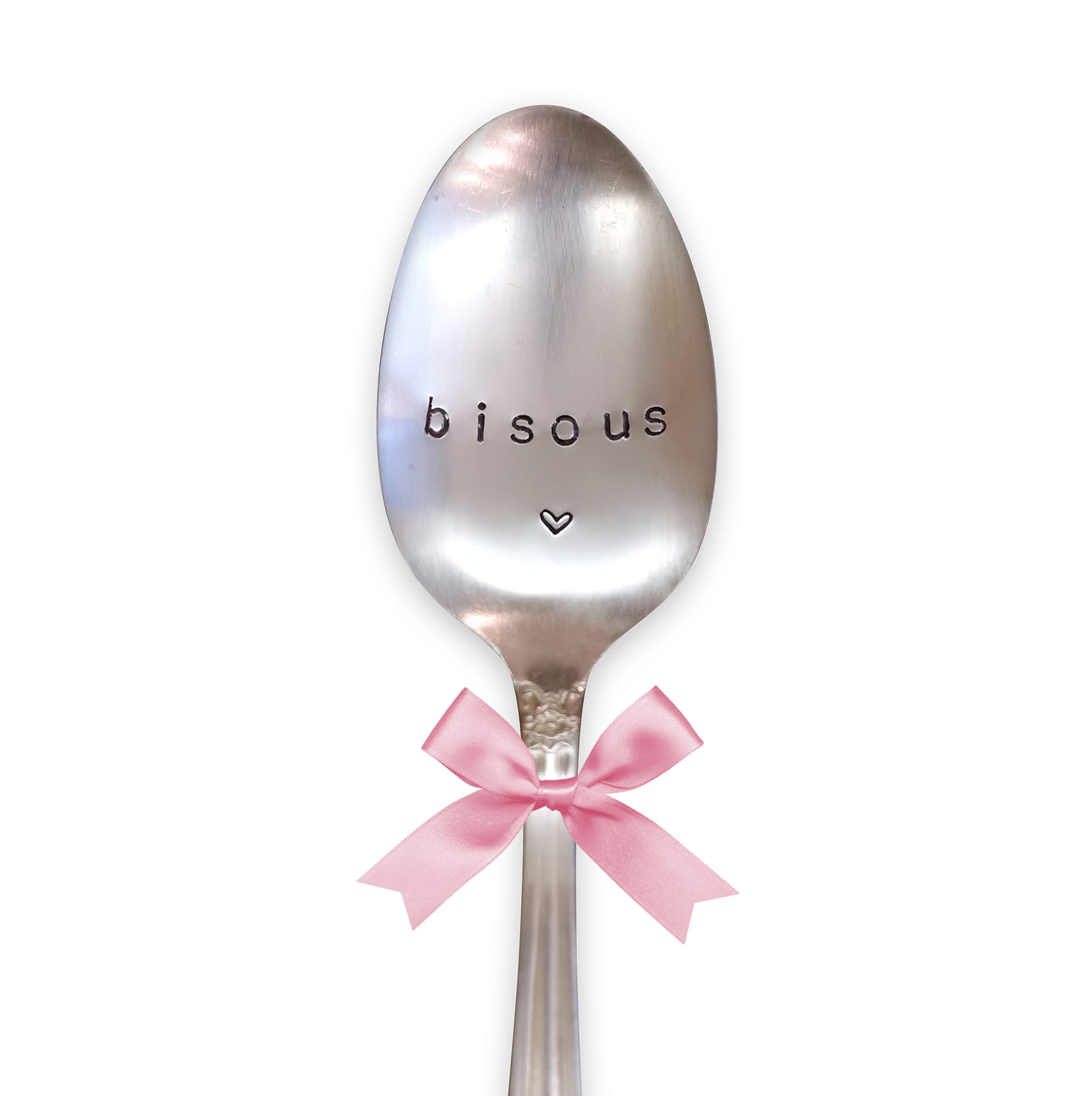 Grande cuillère « Bisous ». Maya, la créatrice de The Loving Spoon, sélectionne et chine les plus belles pièces d’argenterie vintage un peu partout dans le monde. Elle les restaure et les grave à la main une à une avec de jolis messages dans son atelier à Zürich (Suisse). Chaque cuillère est unique ! Une chouette idée de cadeau à faire à un proche (ou à garder pour soi). Lavage à la main conseillé et si votre pièce terni avec le temps (ce qui est normal), nettoyez-la avec un peu de bicarbonate de soude et un peu d’eau !