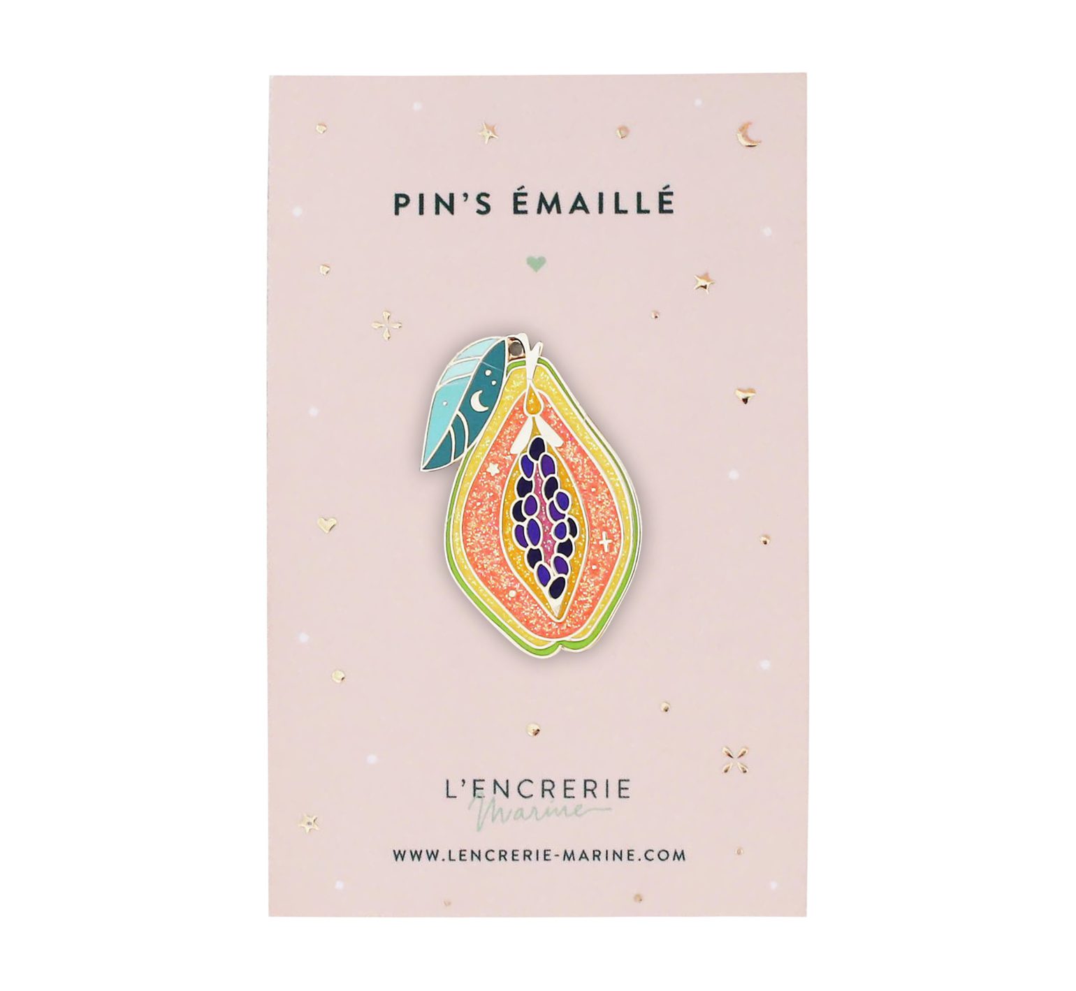 La créatrice de L’encrerie Marine nous ravit avec ses beaux articles. Ce pin’s fruité « Papaye » est un accessoire élégant et délicat. Il habille manteaux, vestes, sacs… des adultes mais aussi des enfants ! À collectionner sans modération. Ce pin’s est épinglé sur une carte parsemée de dorure et douce comme une peau de pêche. Idéal comme cadeau à tous les pin’s addict ! Attache en caoutchouc au dos.