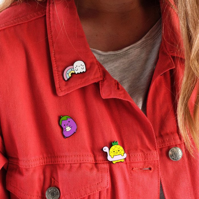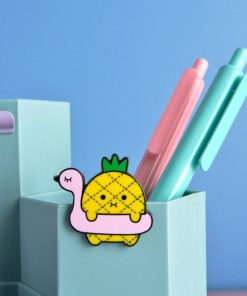 On craque complètement sur ces pin’s Noodoll ! Ces petits personnages aussi mignons que rigolos seront vite adoptés par votre enfant, qui ne voudra plus les quitter… Voici Riceananas: un ananas dans sa bouée rose, prêt pour la baignade. Il est l’accessoire parfait pour agrémenter un pull un peu trop sage, un sac à dos, une trousse d’école, bref, où l’envie nous prends… Composé d’un fermoir en caoutchouc noir au dos. Chaque pin’s est livrée sur une petite carte enveloppée dans un film compostable.