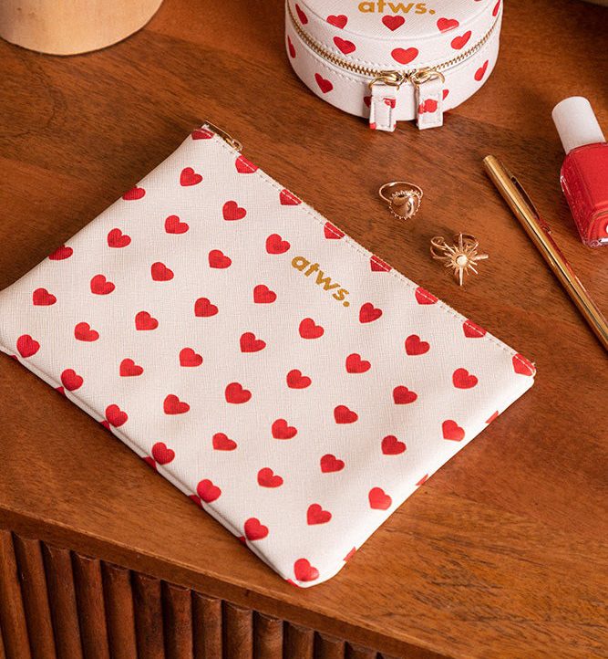 On craque pour le bel univers de la marque française All the Ways to Say ! Cette pochette « Red Hearts » vous aidera à garder précieusement vos affaires lors d’un voyage à l’autre bout du monde, ou simplement au quotidien dans votre sac à main/sac à dos. Matière en cuir polyuréthane (PU leather) molletonné.