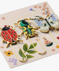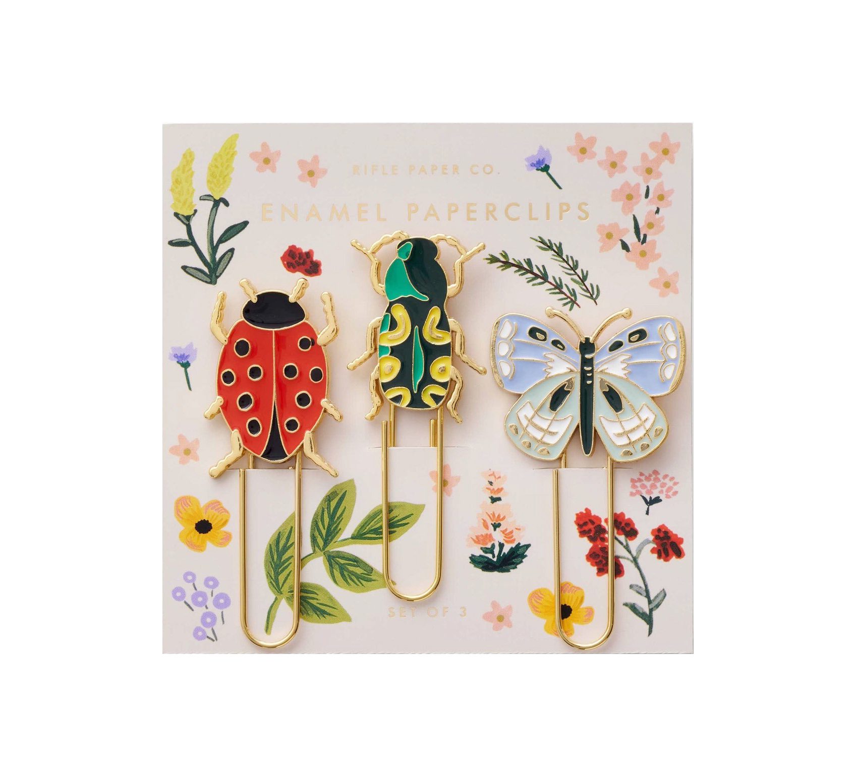 On craque complètement pour les magnifiques accessoires fleuris et poétiques de la marque Rifle Paper ! Ce pack de trois grand trombones en émail sera parfait pour assembler vos documents les plus importants ou comme marque-page. Une jolie idée cadeau ! Le pack contient : une coccinelle, un papillon et un scarabée.