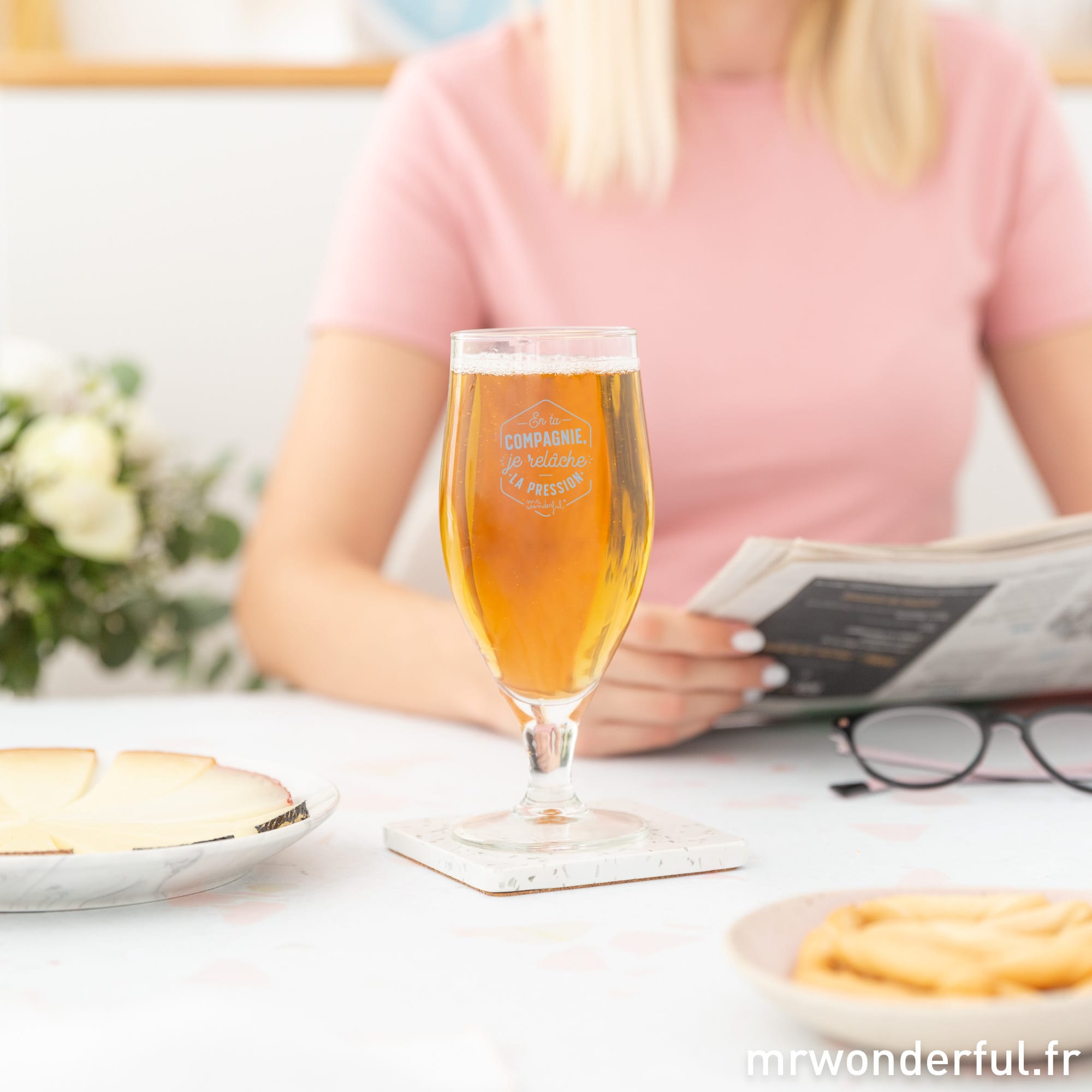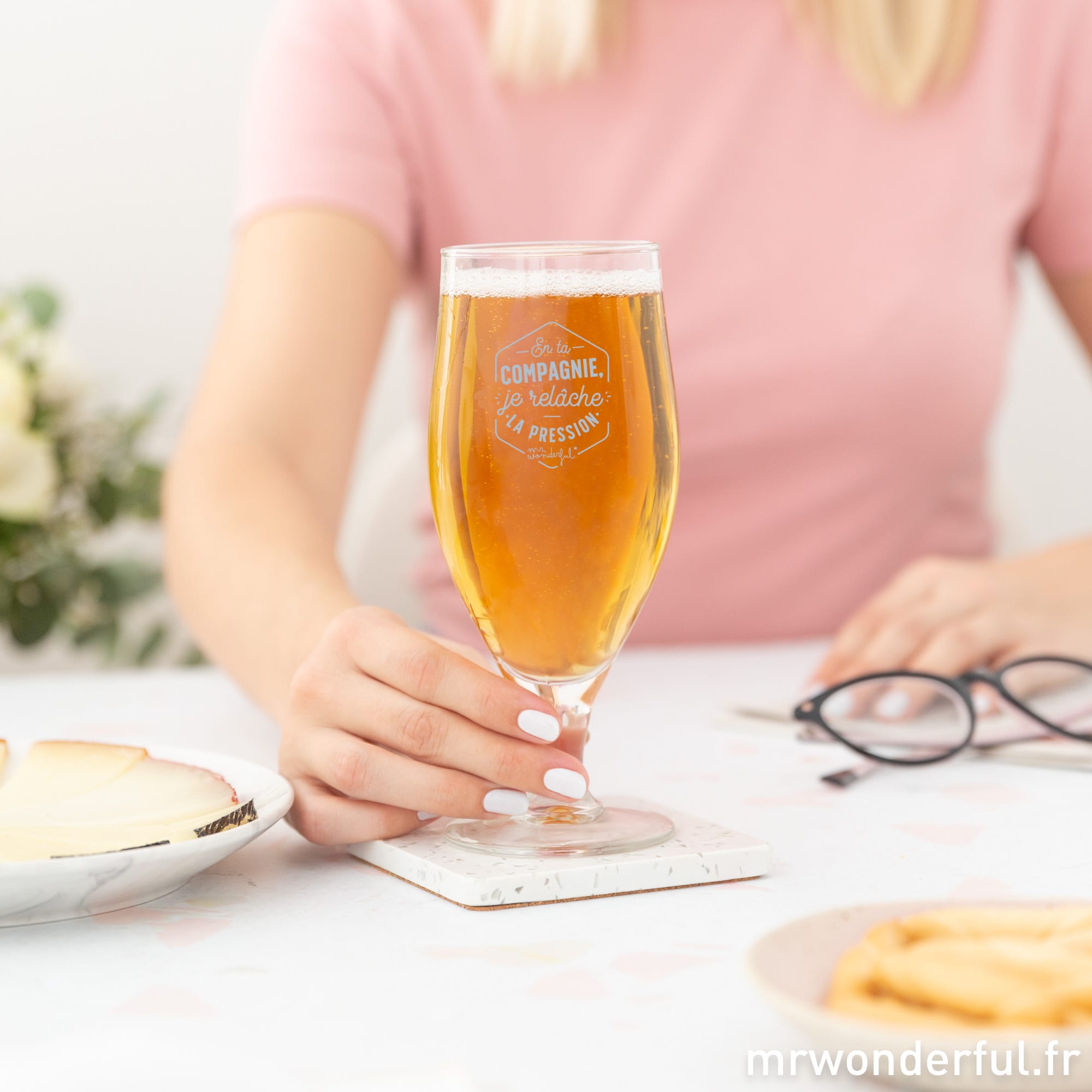 Offrez-lui (ou offrez-vous) un verre à bière original pour profiter d’un moment détente tranquillement sur le canapé ! Après une longue et dure journée, rien de tel qu’un petit verre pour décompresser… Ce verre à bière « En ta compagnie, je relâche la pression » est une jolie idée cadeau made in France par la joyeuse marque Mr. Wonderful. Capacité: 38 cl.