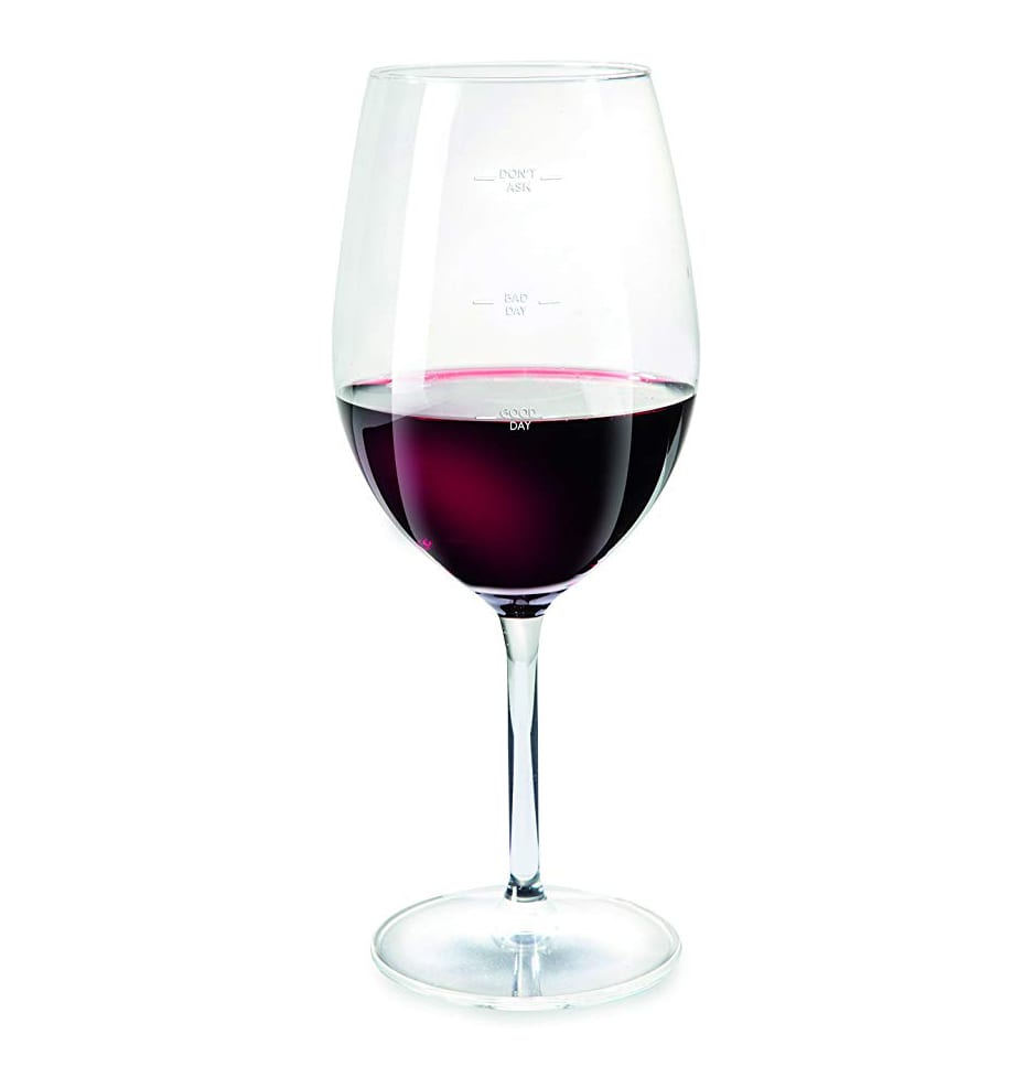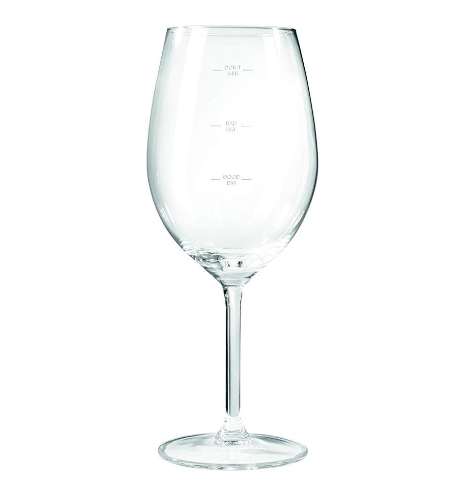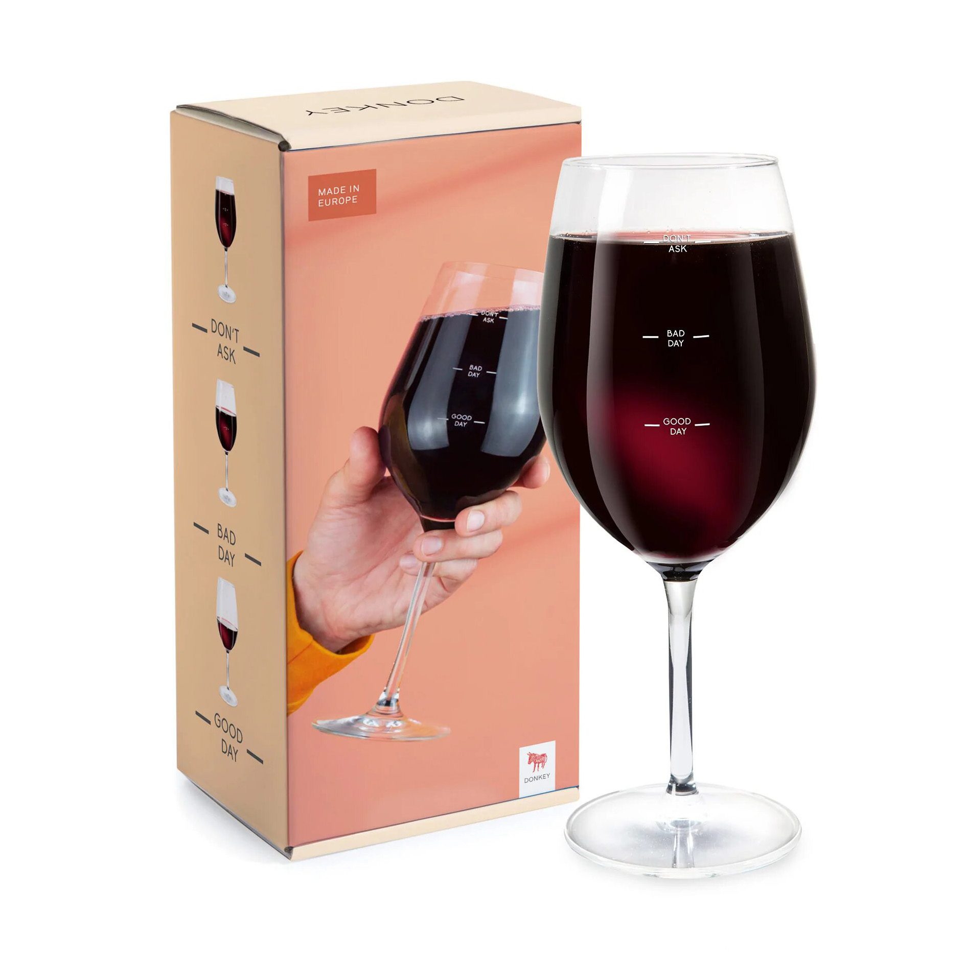 Voici un verre à vin drôle et original ! Moins il y a de vin, plus la journée est bonne et plus le verre est rempli… Mieux vaut ne pas demander comment la journée s’est passé ! À vous de choisir votre humeur du jour avec ces trois graduations: