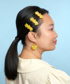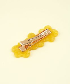 Une série de trois petits boutons d’or jaune au cœur vert vif et aux détails dorés pour maintenir notre chevelure bien en place. Cette jolie barrette s’agrippe parfaitement aux cheveux des enfants comme des adultes pour un look délicieusement printanier. Avec son attache crocodile, cet accessoire pour cheveux s’agrippe partout, même à nos tenues ou notre sac. Fabriquée à partir d’acetate de cellulose recyclée & biodégradable (Eco-Friendly).