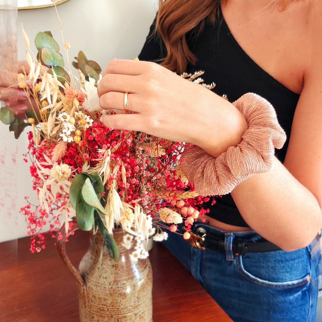 On craque pour les magnifiques chouchous de Laure Derrey. Un accessoire pour cheveux éthique et fabriqué à Paris à partir de chutes de tissus des collections de vêtements de la créatrice ou de déstockage d’étoffes de créateurs. Le chouchou est une pièce caméléon qui permet de nombreuses coiffures et s’adapte à toutes les personnalités. Un accessoire tendance qui peut aussi se garder au poignet, parfait pour pimenter vos looks d’une touche d’originalité en un clin d’oeil ! Entretien: lavage cycle délicat 30°, essorage doux. Couleur or ambre (un rose cuivré à paillette).
