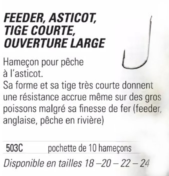 Hameçon spécial anglaise et feeder. Parfaitement adapté à la pêche à l’asticot. Sa tige courte et sa forme lui donnent une résistance accrue qui permet de combattre de gros poissons, malgré sa finesse de fer.