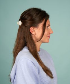 On fond pour cette mini pince à cheveux en forme de petit cœur blanc nacré complètement à croquer. Un accessoire bijou qui se glisse dans tous les sacs, parfait pour une coiffure facile à la va-vite qui apporte la touche de glamour qu’il nous fallait… Fabriquée à partir d’acetate de cellulose recyclée & biodégradable (Eco-Friendly).