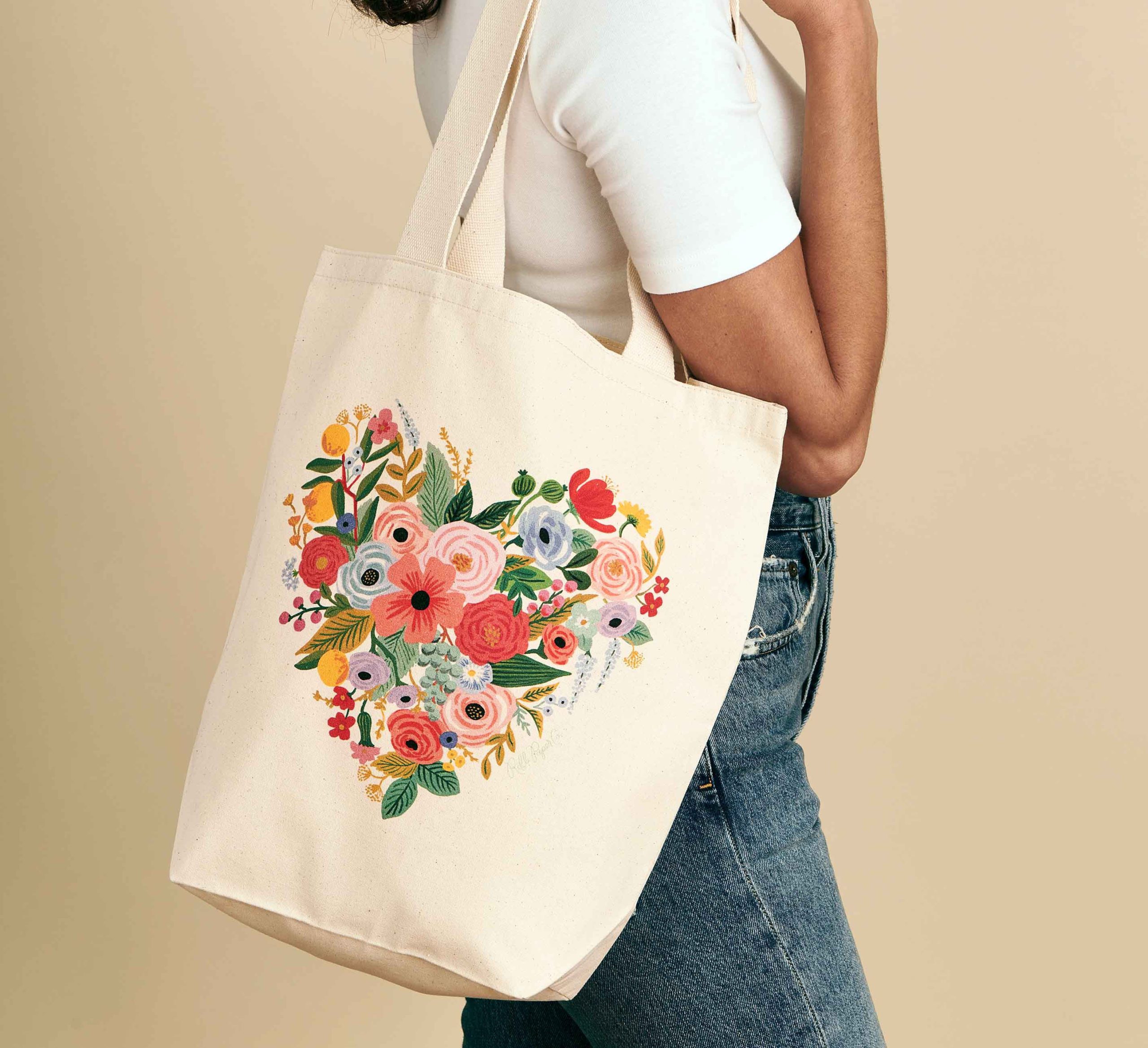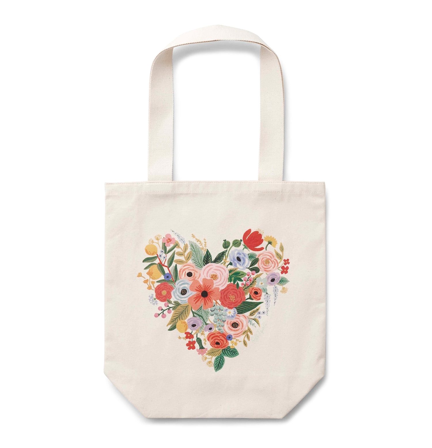 On craque complètement pour les magnifiques accessoires fleuris de la marque Rifle Paper ! Ce tote bag en coton « Floral Heart » vous aidera à transporter précieusement vos affaires lors de vos courses au supermarché, une escapade à la plage ou simplement au quotidien pour aller travailler ! Longueur des anses: 30 cm.