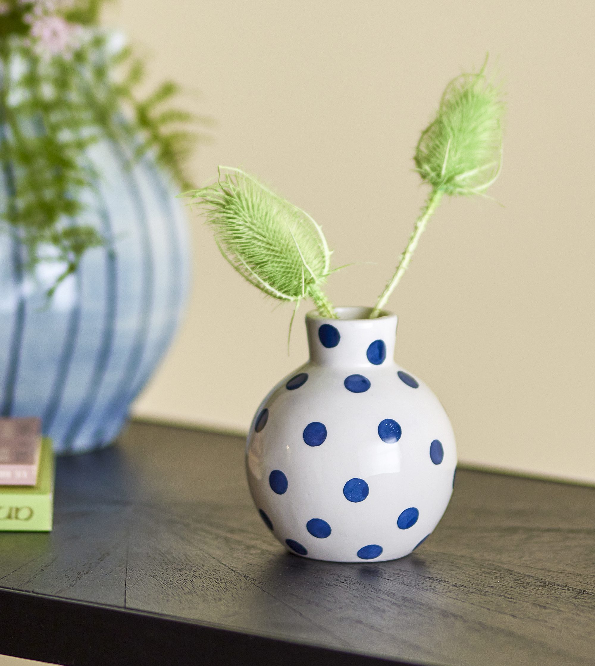 On craque complètement sur ce joli vase Fian de la marque danoise Bloomingville. Il est orné de points bleu foncé peints à la main, ce qui rend chaque vase unique. Il accueillera avec plaisir quelques fleurs (fraiches ou séchées) pour embellir votre intérieur dans le séjour, la chambre à coucher ou le bureau.